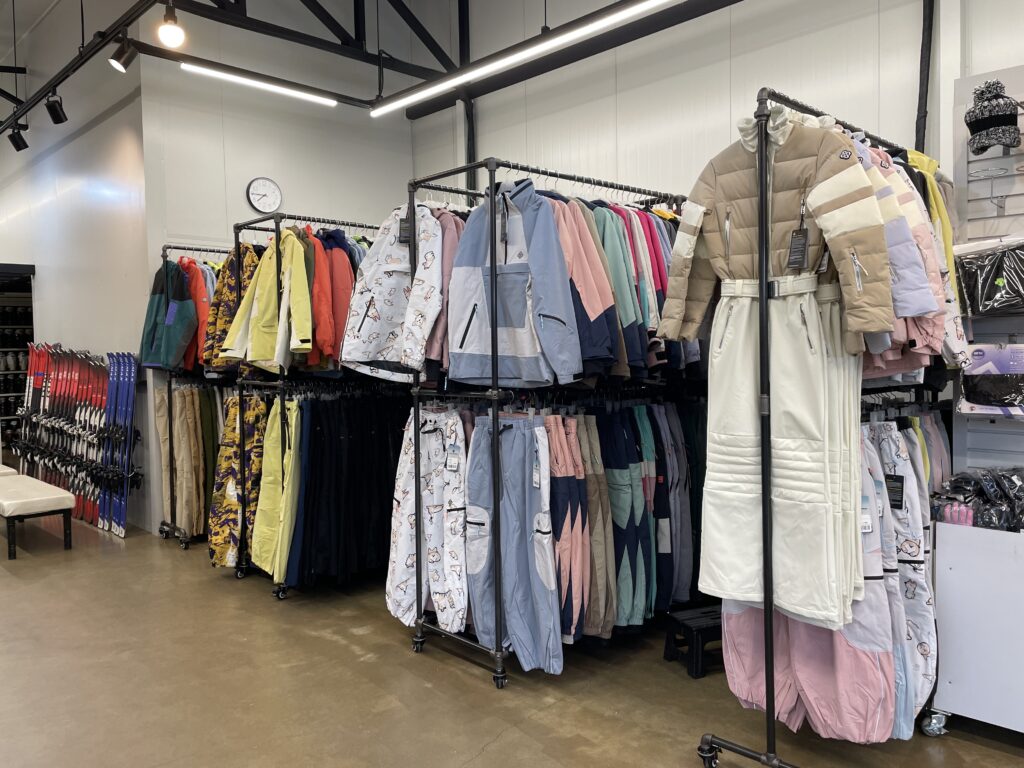 스키는 엘란, 뵐클 브랜드를 사용하며 보드는 버튼 브랜드 부츠와 바인딩을 사용하여 고객만족도가 높습니다. 의류는 약 500벌 이상되며 버튼, 에어블라스터같은 고가 브랜드를 비롯해 686, 언바인드, 인스테이, 디미토, 요비트, 홀리데이, 카레타, 돌아우터웨어 등등 예쁜 스키 보드복을 보유하고 있습니다.